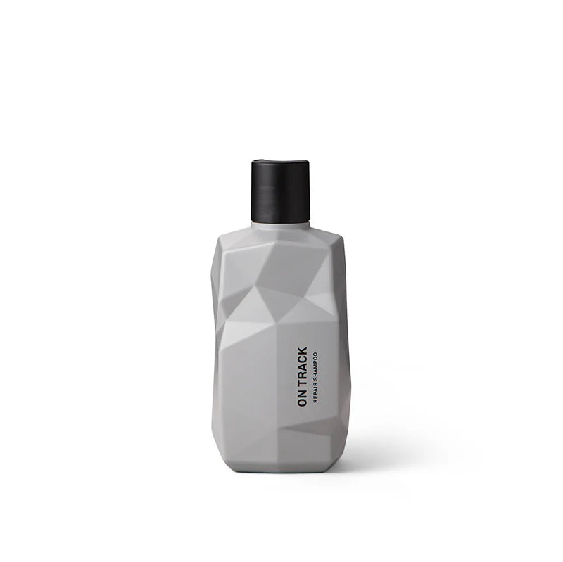 • On Track Repair Shampoo – A sulphate-free cleanse with serious intent. Gently removes impurities while protecting and rebuilding fragile strands with a targeted protein complex.